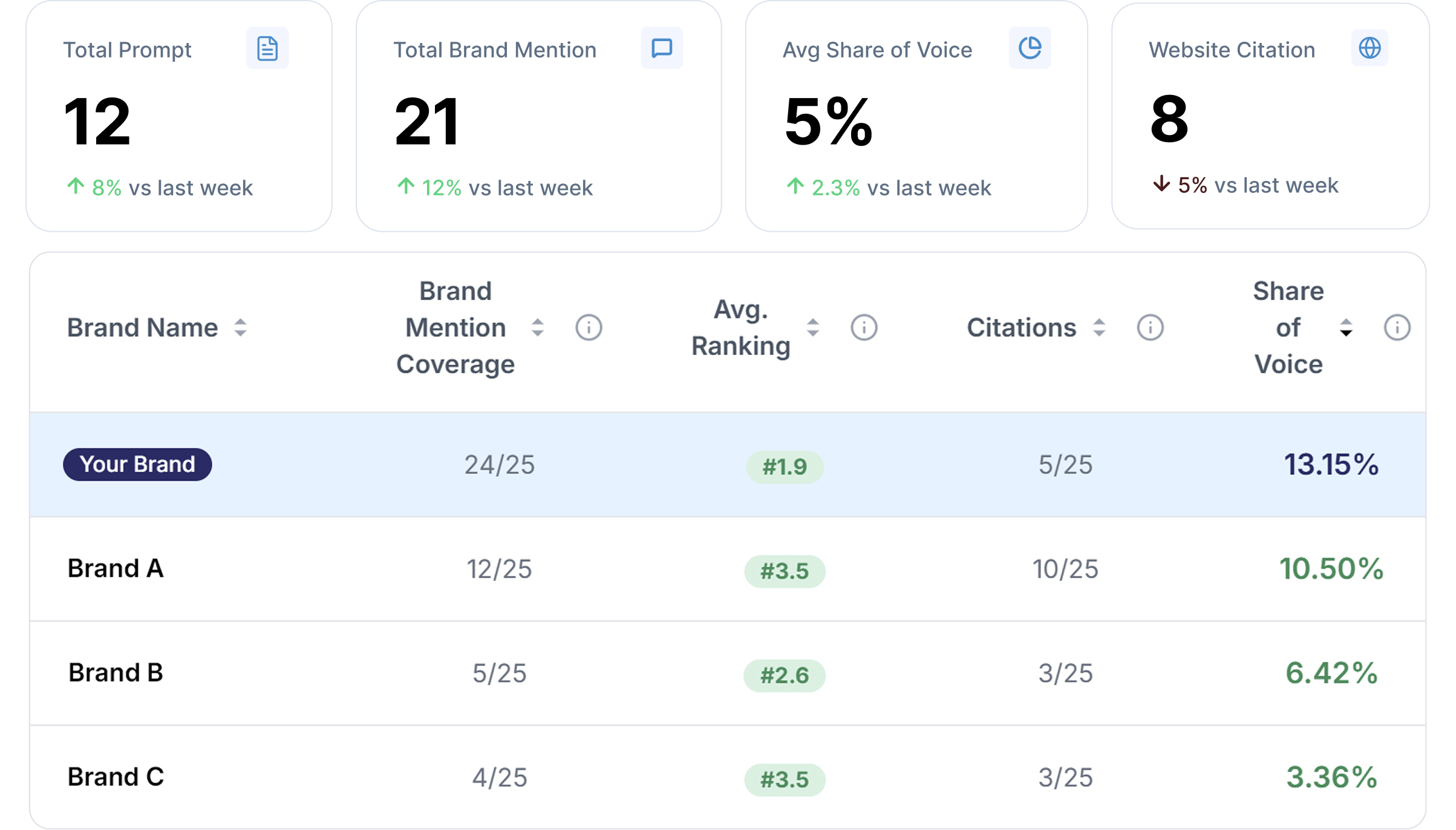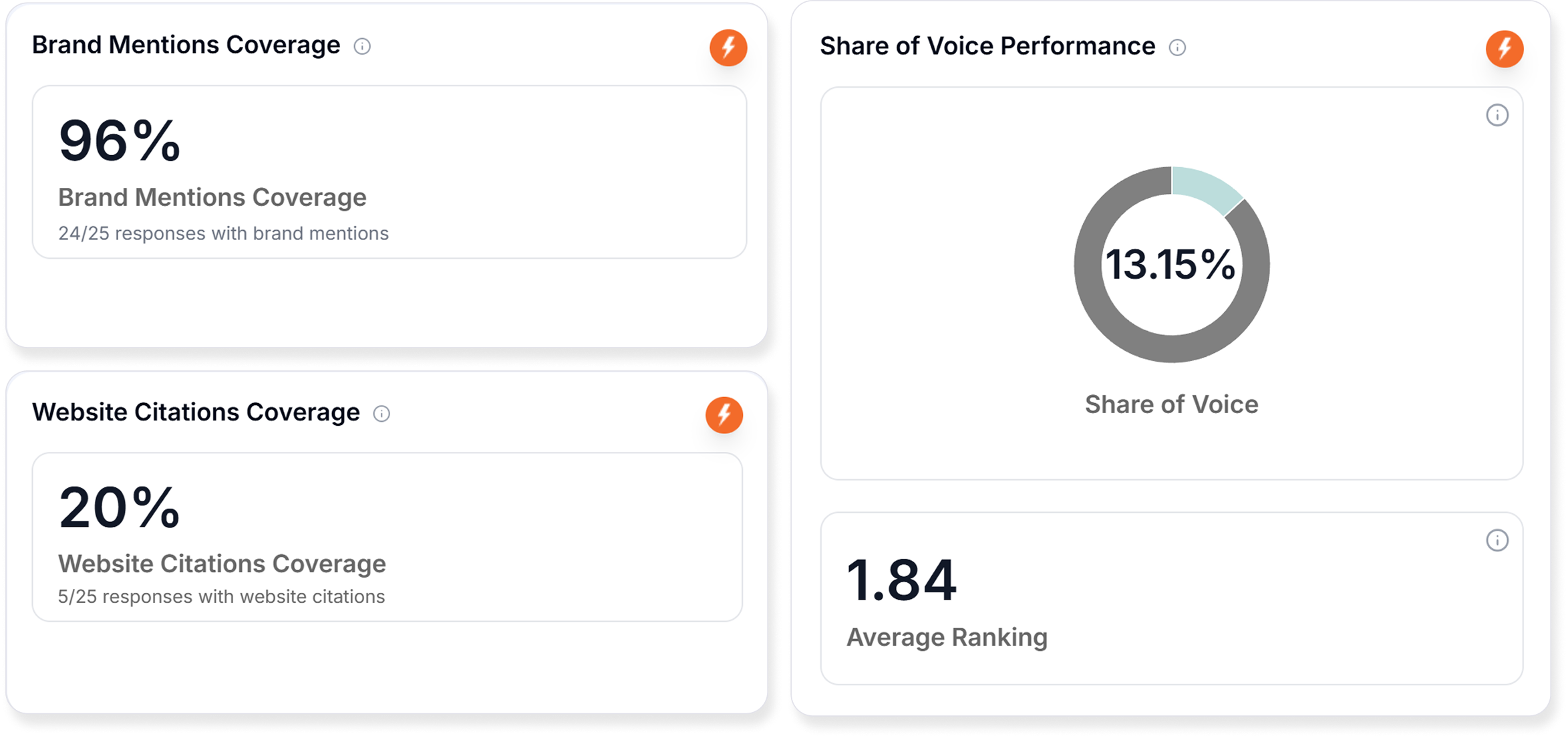 Track Answer Share, Citation Velocity, and market performance. Get board-friendly reports that say what changed, why, and what’s next.