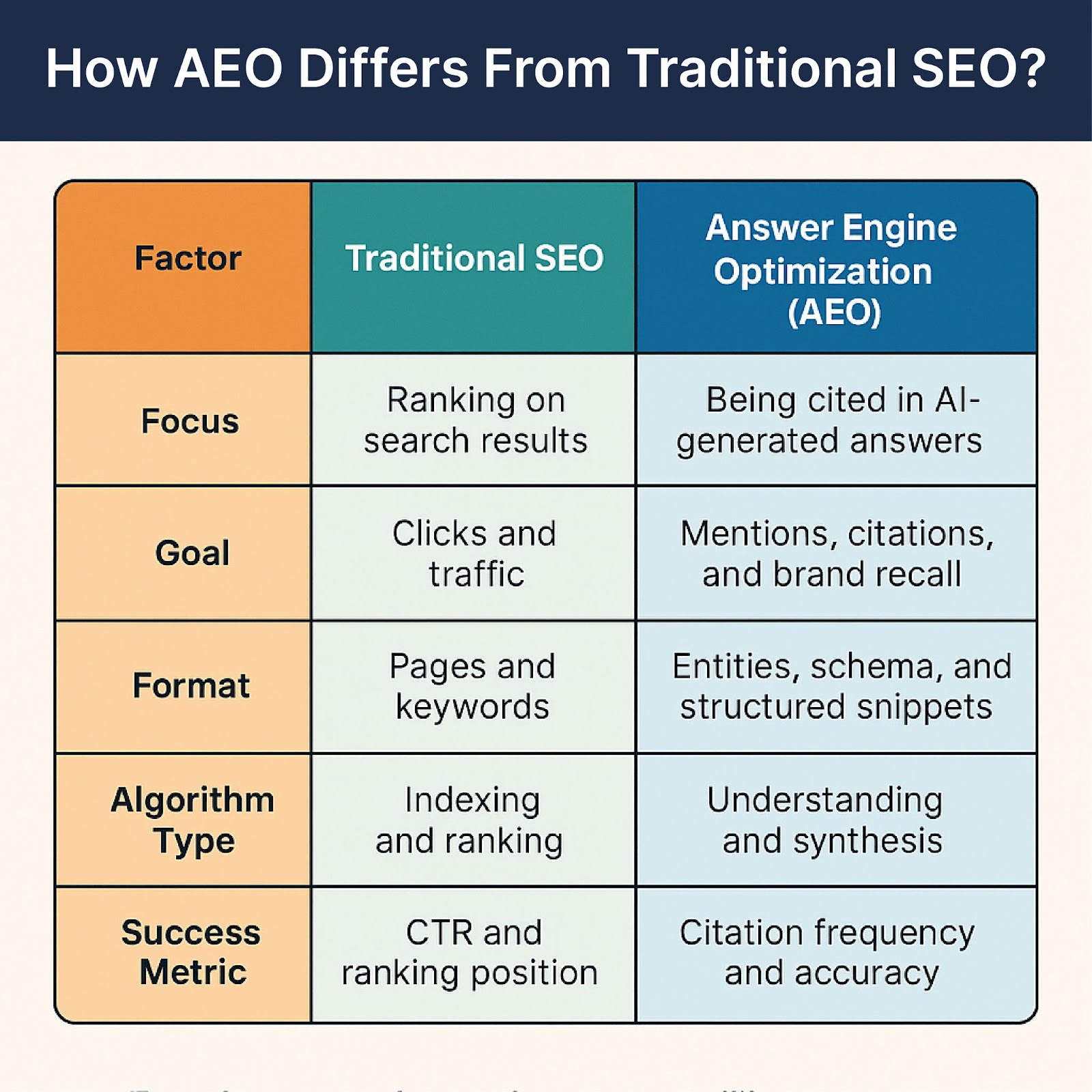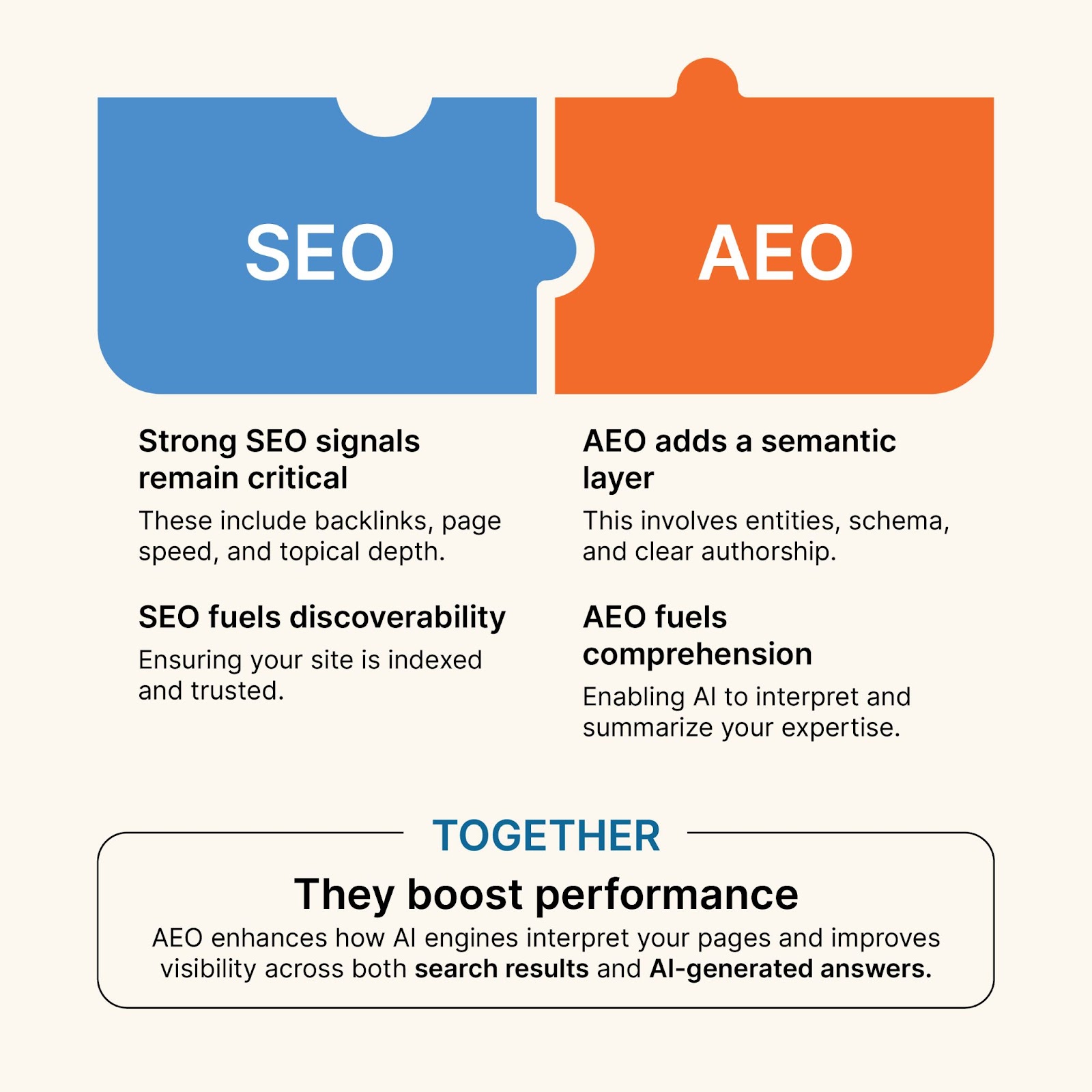 على الرغم من أن SEO وAEO يتشاركان نفس الأساس - جودة المحتوى والثقة والسلطة - إلا أنهما يختلفان في القصد والآليات.