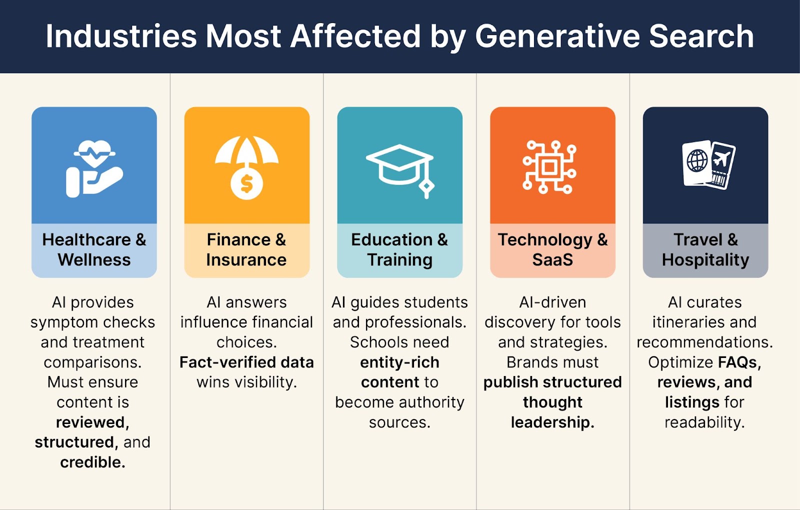 The industries most affected share one thing in common — they rely on informational discovery. These are sectors where customers seek expert answers, comparisons, or guidance before taking action.