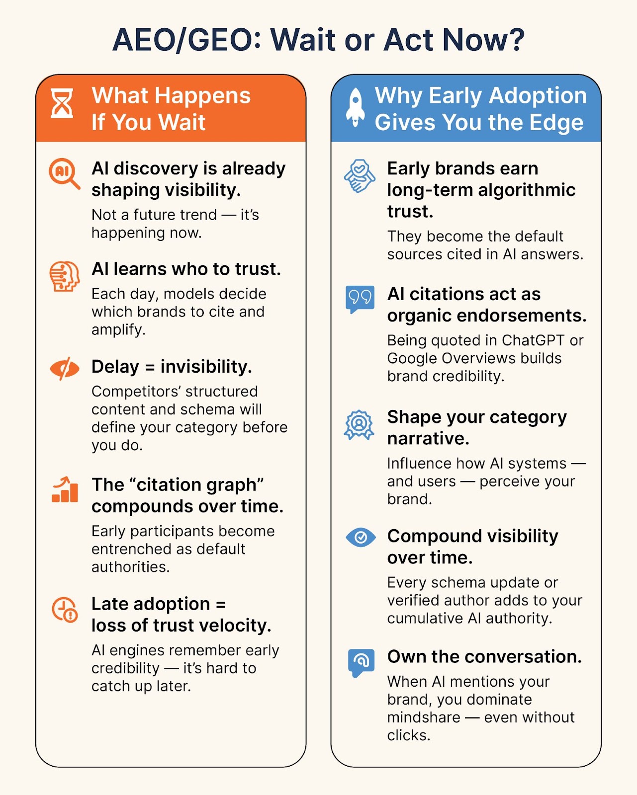 Delaying AEO or GEO implementation means your competitors’ structured content, author pages, and entity markups will define your category before you do. In the world of AI-driven discovery, the gap between being late and being invisible is often just a few quarters.
