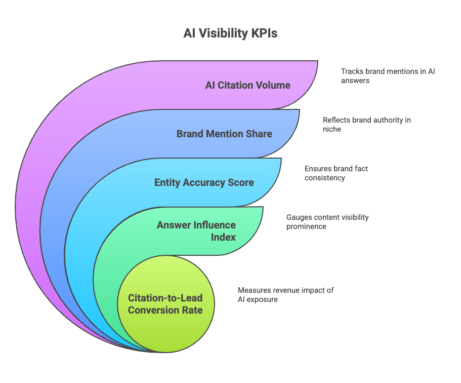 Instead, AI visibility requires metrics that measure influence, authority, and representation — even when clicks don’t occur.